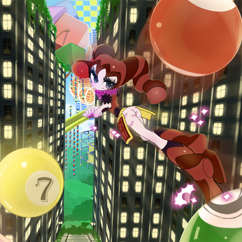 去年の、15周年絵が、メモリーフォレストだったので、今回はデライトシティにしました。両方とも「夜」が重要な要素になってくるステージですが、去年とは違って明るい感じの画面になるように調整してみました。